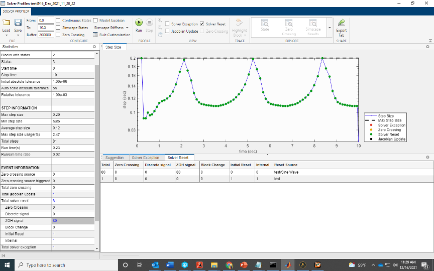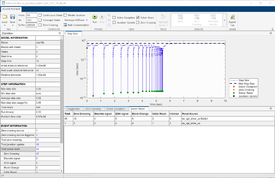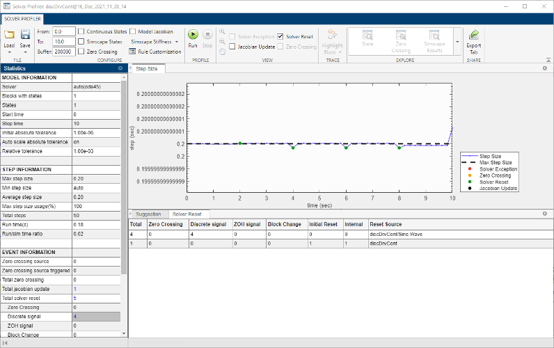 Observe from the profiling results that there are 130 solver resets triggered by a block. A solver reset event can have multiple causes. In this case, zero crossings and block changes cause a solver reset event.