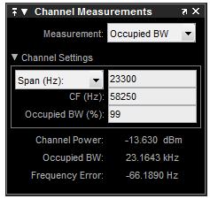 Occupied BWas the Measurement type.Frequency Error — The difference between the center of the occupied band and the center frequency (CF) of the channel. This setting is available only if you select