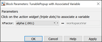Associate Variableassociates a variable with the popup parameter. The parameter values and display strings are populated from external enumeration fileXFactor.m. The popup parameter is associated with model workspace variableworkspaceVar.