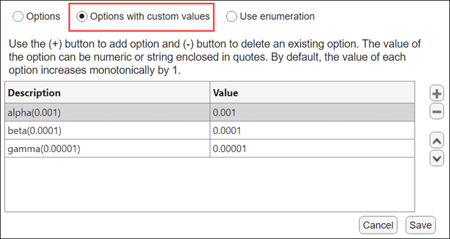 The parameter value is evaluated as the value associated with the enumeration member corresponding to the display name you select. For example, if you select alpha(0.001) from the XFactorParam options drop-down list, the value of XFactorParam is set to 0.001.
