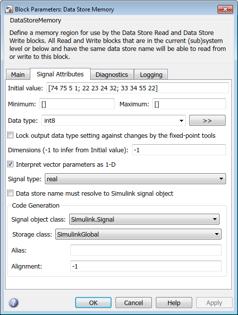 object in a MATLAB System block and the associated Data Store