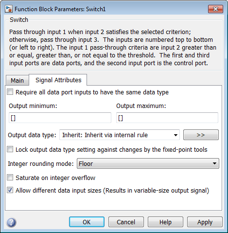 Switching blocks support variable-size signals by allowing input signals with different sizes and propagating the size of the input signal to the output signal. You can set the Allow different data input sizes parameter for these blocks on the Signal Attributes pane to either on or off.