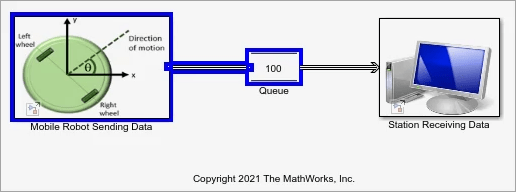 In this example, the robot sends its velocity in x- and y- directions to the base station and its relative angle (direction of motion) values to a base station. The station's data consumption rate is slower than the data sent by the robot. A Queue block is used as a message buffer.