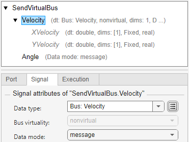 SendVirtualBus.Velocitycreates the virtual busSendVirtualBuswith theVelocityelement. In the block, Data type is set toBus: Velocity, and Data mode is set tomessage.