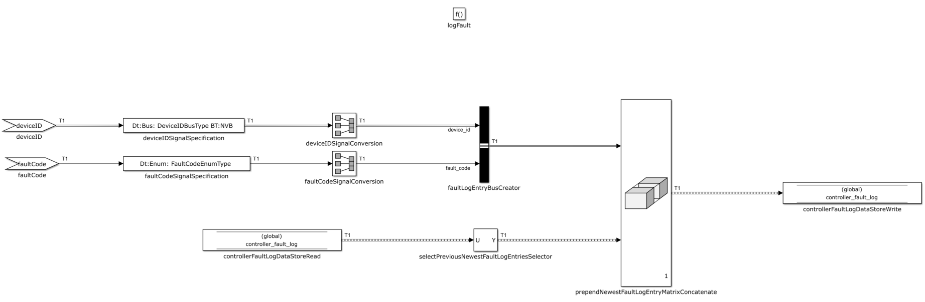 When the controller detects a fault, the fault is recorded in a fault log, which is modeled by a Data Store Memory block, representing an area of RAM in the controller. Each log entry consists of the device ID and the type of fault: pressure too high, pressure too low, lost contact with sensor. The type of fault is an enumerated data type defined for this purpose. The combination of device ID and type of fault used in the fault log entries form a composite signal type, is defined using a Simulink.bus type with these two fields. The Simulink function logFault performs the fault logging by prepending the new fault information to the fault log. The Stateflow chart calls this function each time it detects a fault.