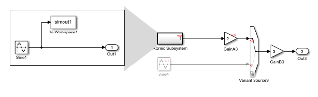 In this example, the Variant Source3 block has a variant condition V == 1 that propagates to Atomic Subsystem. Since Atomic Subsystem is a nonvirtual subsystem, the variant condition applies to Atomic Subsystem and to all blocks within the subsystem. Like the grouped virtual subsystem Subsystem1, Atomic Subsystem is conditional.