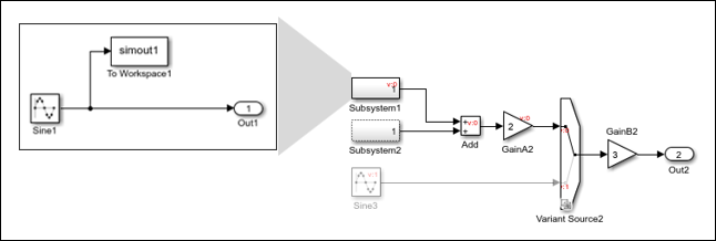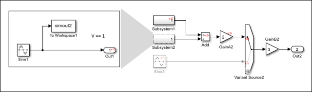 In this example, the Variant Source2 block has a variant condition V == 1 that propagates to Subsystem2. Since Subsystem2 is an ungrouped subsystem, the variant condition propagates to the blocks within the subsystem.