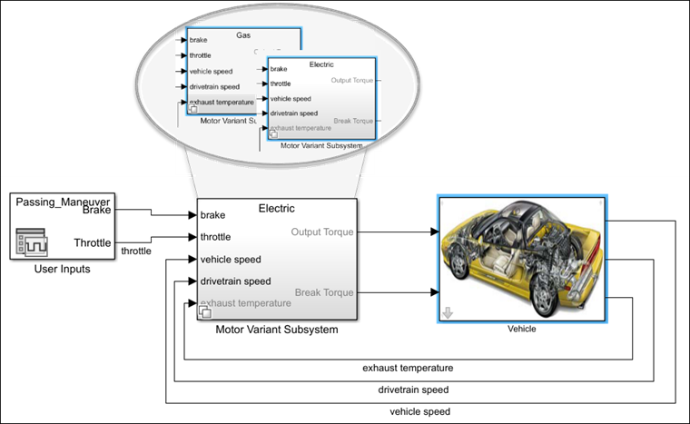 This example shows variant design in a Simulink model. Consider the requirement to model a system that represents an automobile with several configurations. These configurations, although similar in several aspects, can differ in properties such as fuel consumption, motor type, or emission standard.
