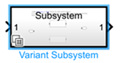 | Hierarchical variant blocks | Variant Subsystem | The Variant Subsystem block is a template preconfigured with Subsystem blocks to represent the variant choices. The Variant Subsystem block allows a combination of Subsystem blocks, Model blocks, or Subsystem Reference blocks as variant choices. |