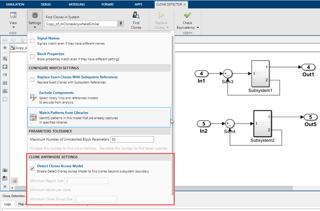clonedetection("similar_clones_model").To set up the parameters for clone detection, click Settings. Under Clone anywhere settings, click Detect Clones Across Model.