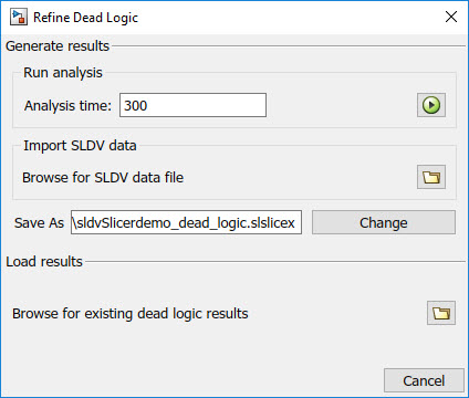 4. Specify the Analysis time and run the analysis. You can import existing dead logic results from the sldvData file or load existing .slslicex data for analysis. For more information, see Refine Highlighted Model by Using Existing .slslicex or Dead Logic Results.