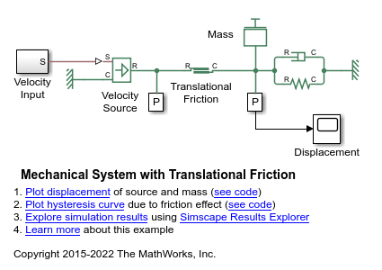 openExample('simscape/MechanicalSystemWithTranslationalFrictionExample','SupportingFile', 'MechanicalSystemWithTranslationalFriction.slx') % save system, export to FMU with variable step solver requires model write permission save_system('MechanicalSystemWithTranslationalFriction', 'mechanical_system_local', 'OverwriteIfChangedOnDisk',true);