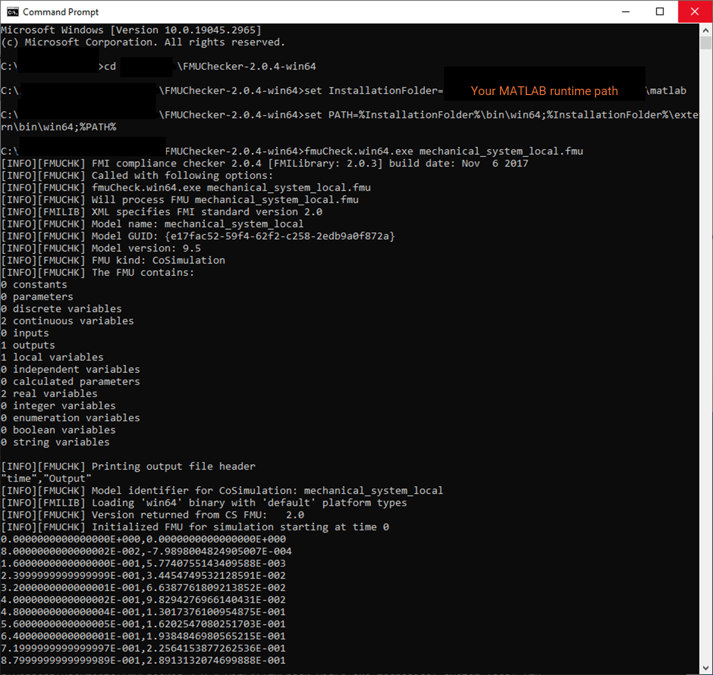 To run the FMU with FMU Compliance Checker, open the Command Prompt and go to the location where FMU Compliance Checker is installed. Set environment variable with the command illustrated in the previous section.