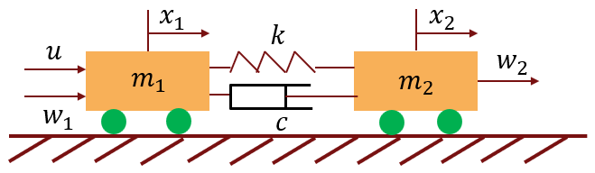The spring-mass-damper system consists of two carts of mass and , connected to each other through a spring with stiffness coefficient and a damper with damping coefficient [1].
