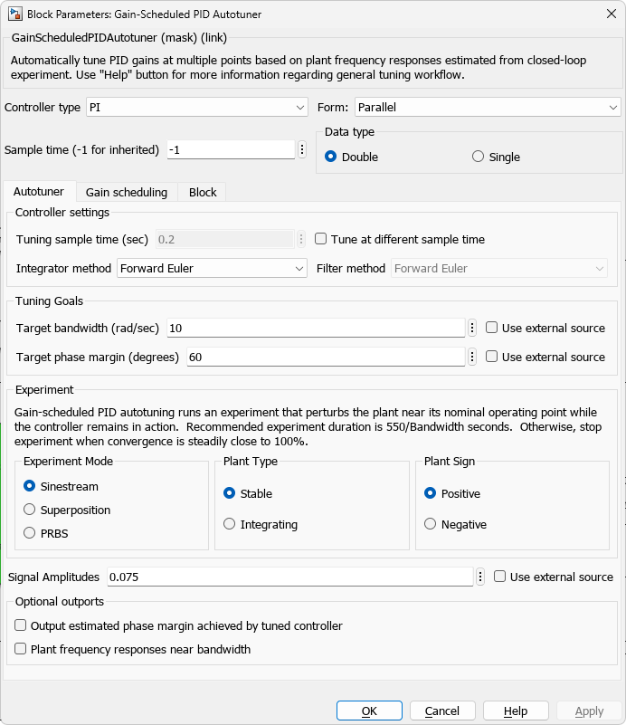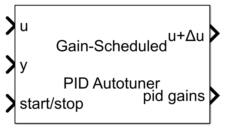 The autotuning workflow for this block is similar to the Closed-Loop PID Autotuner. The Gain-Scheduled PID Autotuner block allows you to tune one PID controller at a time. It injects perturbation signals at the plant input and measures the plant output during a closed-loop experiment. When the experiment stops, the block computes PID gains based on the plant frequency responses estimated at a small number of points near the desired bandwidth. The tuned PID gains are stored and the existing gain array, if available, is updated at the corresponding value of the scheduling variable (by default the scheduling variable is the same as the plant output). The Gain-Scheduled PID Autotuner block will also automatically determine the current PID gains based on the current value of the scheduling variable and output the corresponding gains for use in a PID Controller.