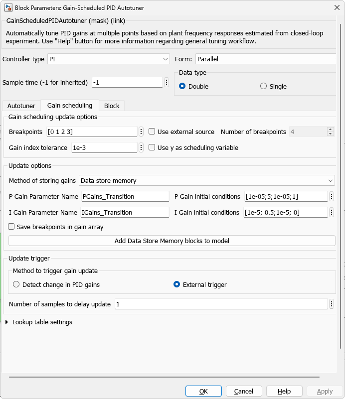 Next, the block is configured gain scheduling on the Gain scheduling tab as follows: