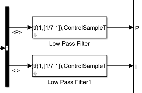 The gains from the Gain Scheduled PID Autotuner are output and fed back to the PID Controller block. The gains are filtered with a first order filter to prevent step changes in the PID gains when changing from one flight mode to another. This is necessary as the scheduling variable used here is the flight mode which experiences a step change every time the mode switches. This first order filter is set to allow the gains to reach their final value in about 300 ms.