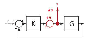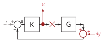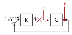 | Specifies an additive input to a signal. To define a transfer function for a linearized system, you can use an input perturbation with an output measurement or open-loop output. For example, to compute the response G/(1+GK) in the example system, specify an input perturbation du and an output measurement y as shown.