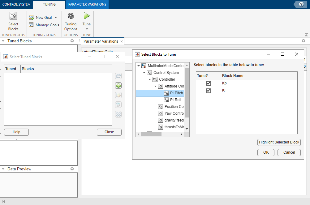 To specify parameter variations, on the Control System tab, click Select parameters to vary from the Parameter Variations list. To select model variables, on the Parameter Variations tab, click Manage Parameters. Select the rotor4ThrustGain parameter and click OK to add it to the Parameter Variations table.
