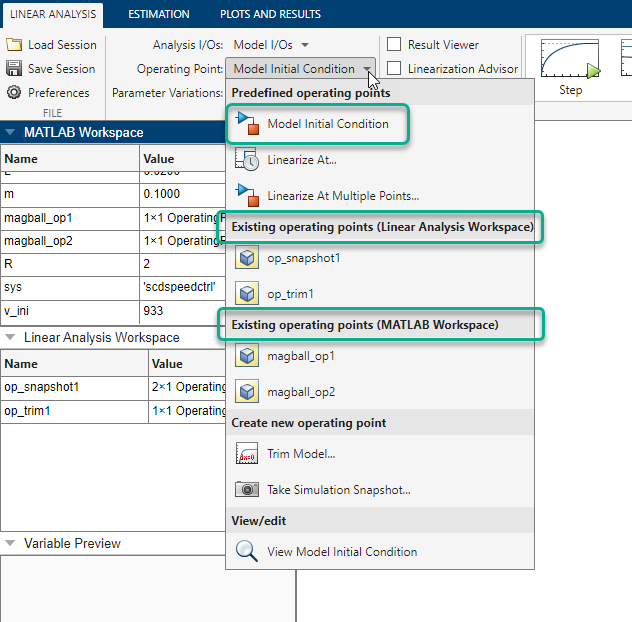 Model Initial Condition— The current states and inputs in the modelAn operating point listed under Existing Operating Points (Linear Analysis Workspace) — These operating points are listed in the data browser in the Linear Analysis Workspace section. When you find an operating point using trimming or a simulation snapshot, the software adds it to this list of operating points.
