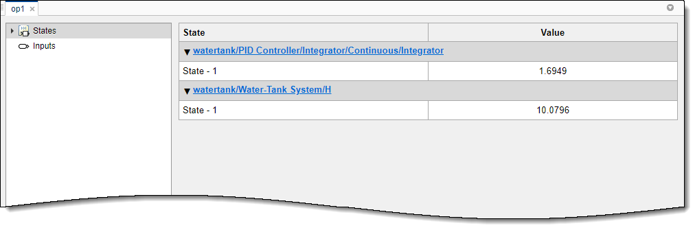 op = operpoint(sys)op = Operating point for the Model watertank. (Time-Varying Components Evaluated at time t=0) States: ---------- x _ (1.) watertank/PID Controller/Integrator/Continuous/Integrator 0 (2.) watertank/Water-Tank System/H 1 Inputs: None ----------