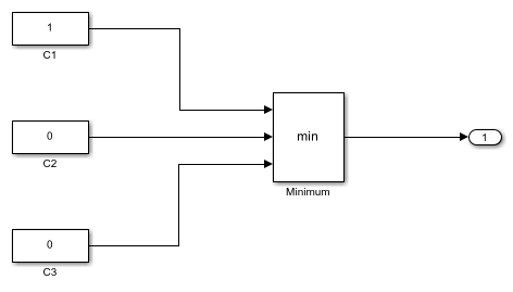 The slcoverageMinMax model includes three Constant blocks connected to a MinMax block with the Function parameter set to min. In this example, you look at relational boundary coverage results for three different sets of inputs: