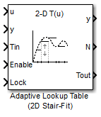uas the rpm,yas the pressure, andyas the efficiency signals.Tin— The initial table data.Enable— Signal to enable, disable, or reset the adaptation process.Lock— Signal to update only specified cells in the table.y— Value of the cell currently being adapted.N— Number of the cell currently being adapted.Tout— Values of the adapted table data.