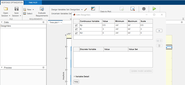 We select the PID controller parameters to tune by opening the Design Variables editor, as shown below.