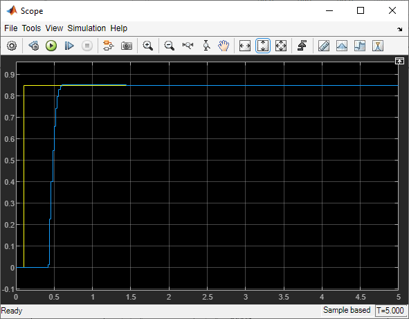 Once we complete the optimization, it is important to validate the results against other step sizes. A successful parameter optimization should be able to provide good control for all steps sizes close to the tuned step size of 1. Step sizes from .7 to 1 should be tested to confirm the controller's performance. The following plot shows the response to a step input from 0 to 0.85 at 0.1 seconds.