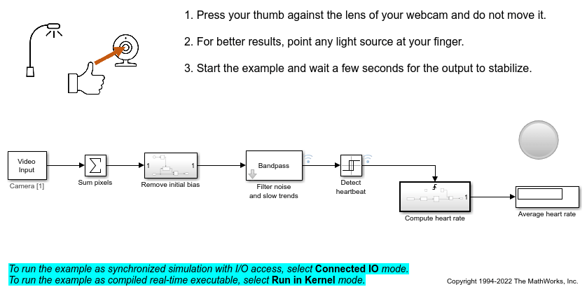 The example model sldrtex_heartrate shows how to take heart rate measurements using Simulink® Desktop Real-Time™ using a camera and the Video Input block. To measure heart rate, a person presses a thumb against the camera lens, optionally pointing a light source at the thumb to improve lighting conditions.
