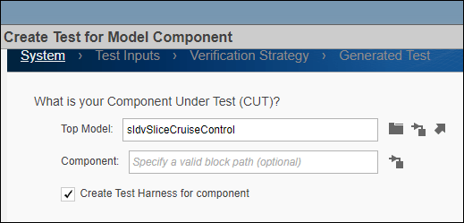 If you want to test a component under test or subsystems in Simulink Test, you can use the Create Test for Component wizard by selecting New > Create Test for Model Component Simulink Test Test Manager, Use Design Verifier to generate test input scenarios. For detailed information, see Generate Tests and Test Harnesses for a Model or Components (Simulink Test).