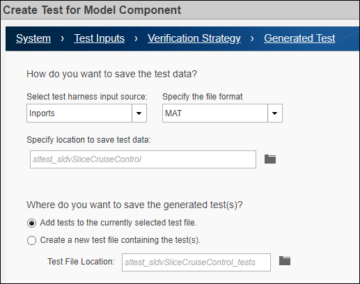 7. Click Next to specify the input source, format, and where to save the test data and generated tests. For Specify the file format, select MAT. For Specify location to save test data, use the default location name.