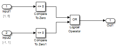 • The output from Input1 is never less than 0, therefore the first input to the Logical Operator block is never false. The objective that the first input to the Logical Operator equals false is unsatisfiable.