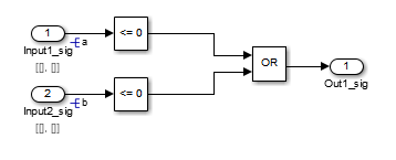 2. The minimum and maximum values are specified on the Simulink.Signal objects associated with signals a and b. Simulink Design Verifier uses the signal object's values as constraints. When multiple minimum and maximum values are specified, e.g., on the inport and on the signal object, Simulink Design Verifier considers their tightest range.