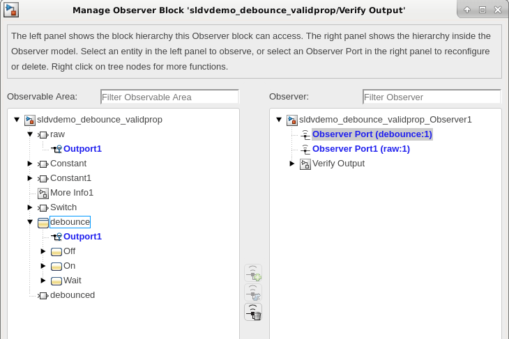 5. Double-click one of the Observer Port blocks to open the Manage Observer Block window. The two signals, debounce and raw, are automatically map to the two Observer Port blocks in the sldvdemo_debounce_validprop_Observer1 Observer model.