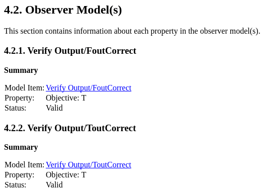 The analysis report shows the Observer information for property proving in the Observer Model(s) section of the Properties chapter.