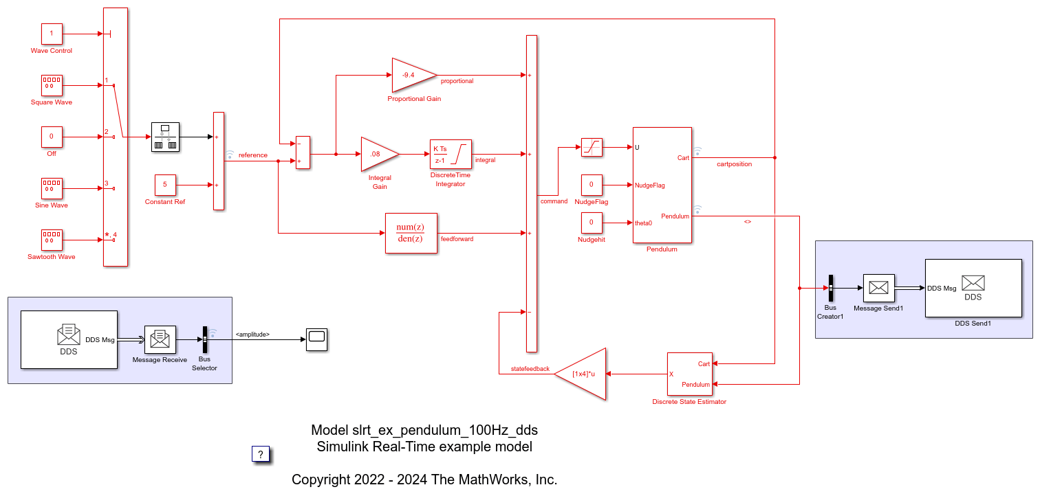 Using this example build the slrt_ex_pendulum_100Hz_dds model, and deploy the application on a target computer. Start running the application, and observe the data from DDS Send block is received by the DDS Receive block by using the Simulink Data Inspector.