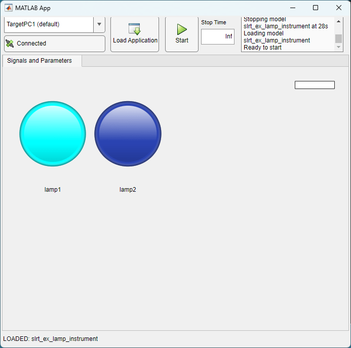 After modifying the instrument panel app, run the app slrt_ex_lamp_instrument_slrealtime-mlapp.