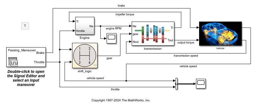 gearsignals, setting their control names togear_2,gear_3, andgear_4. Set their control values to 2, 3, and 4.To display the transmission speed in revolutions per minute (RPM) in the generated instrument panel, in the Signals and Parameters panel, select the