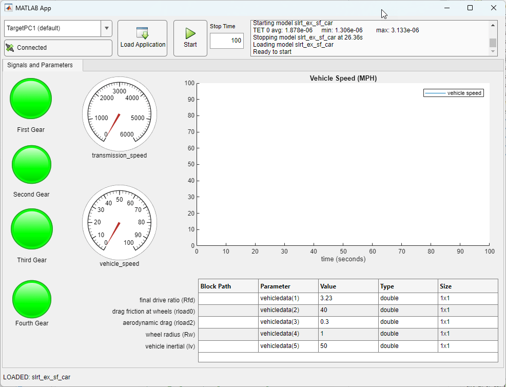 model = 'slrt_ex_sf_car'; open_system(model); modelSTF = getSTFName(tg); set_param(model,"SystemTargetFile",modelSTF); evalc('slbuild(model)'); load(tg,model);