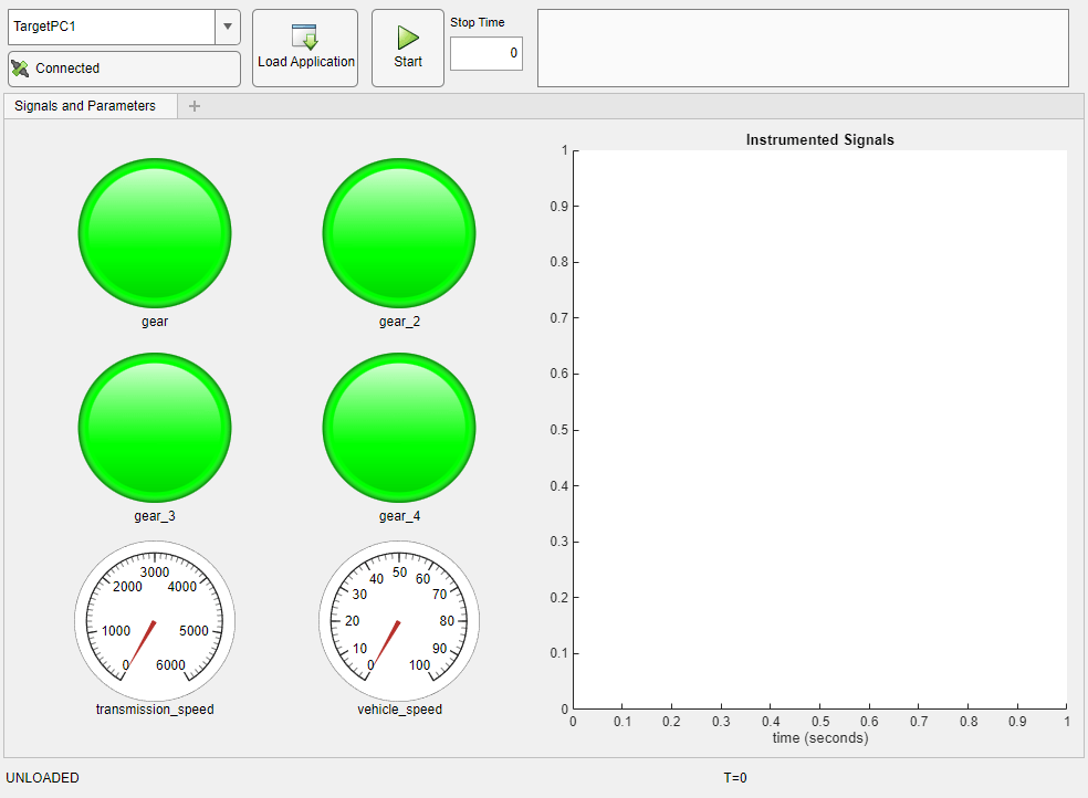 This example loads the real-time application on the target computer. But, you do not have to have a real-time application loaded on the target computer to use the Simulink Real-Time App Generator to generate an instrument panel app.