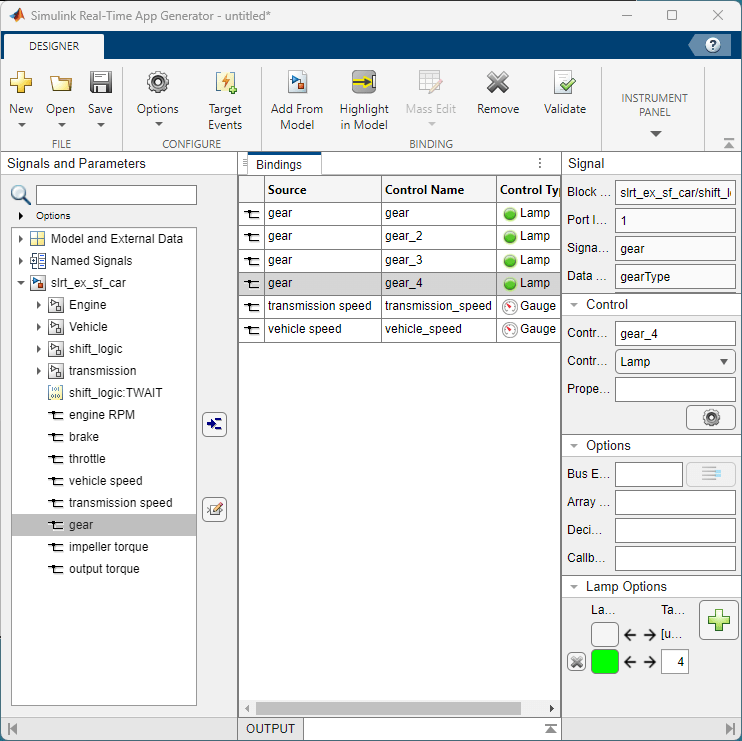 gearsignal in the Bindings tab. In the Properties panel, the Control Name is set togear_1. In Lamp Options, add a Target Value and set the value to1to match the gear number. Set the Lamp Color for the added value to green.Repeat this process for the control name, lamp control value, and lamp color of the other