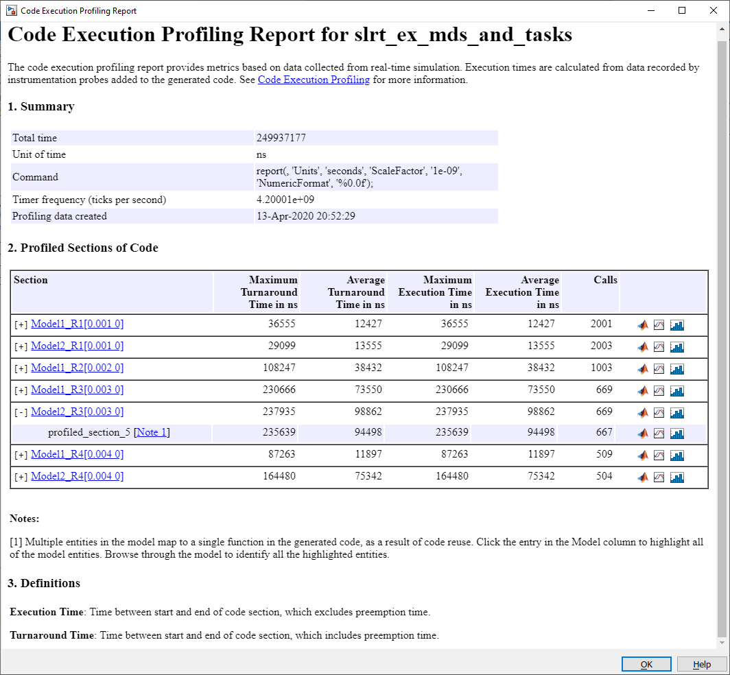 The Code Execution Profiling Report displays model execution profile results for each task.
