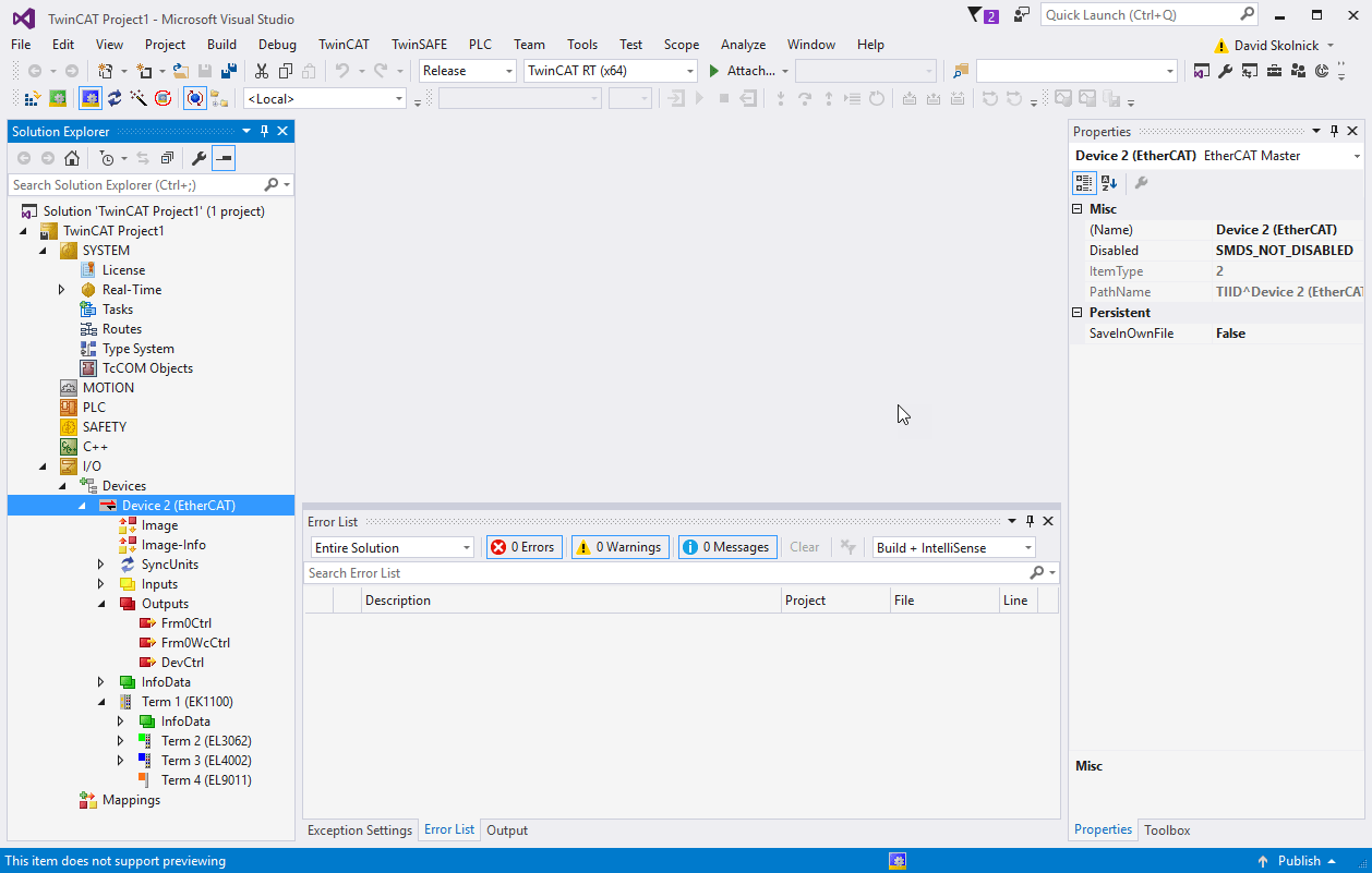 6. Go to TWINCAT in the menu and select Scan. You can also right click Solution Explorer > your TwinCAT project > I/O > Devices > Scan.