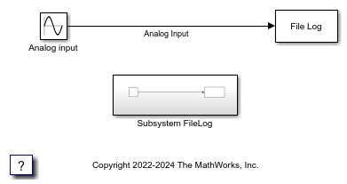 Open the model slrt_ex_filelogtunabledecimation>. This model uses File Log blocks to log data on the target computer. The default setting for decimation is set to 1 for the File Log blocks. In the MATLAB Command Window, type: