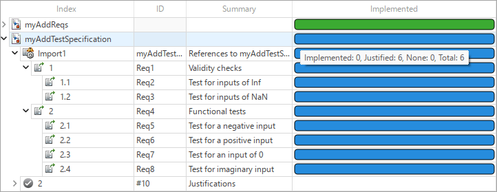 In this step of the tutorial, you view the implementation status for the myAddReqs requirement set, change the link types for the MATLAB® code links to Implement, and justify the exclusion of requirements in myAddTestSpecification from the implementation status.