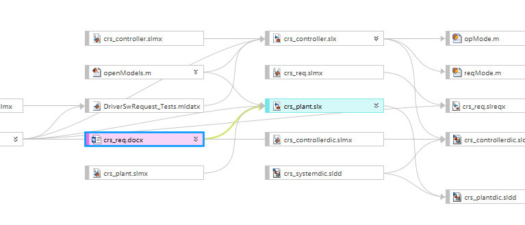 We will focus on a small part of this Project's Dependency Graph: open the crs_plant.slx Simulink® model, that has several links to an external Microsoft® Word document crs_reqs.docx.