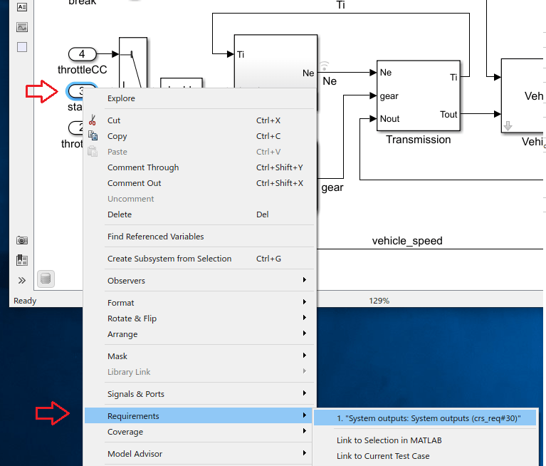 Open the CruiseRequirementsExample project and open the crs_plant model. Find the link set for crs_plant and the requirement set crs_req.