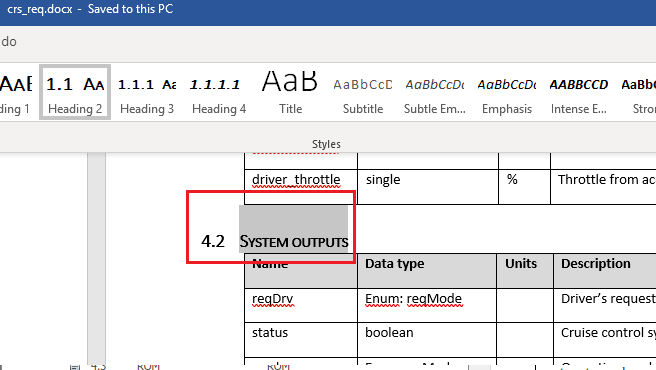 As demonstrated above, when imported references are available in the Requirements Editor, navigating a link will select the matching reference object. However, we have just updated links for a new version of the document crs_req_v2.docx, and there are no imported references for this document. Navigation from Simulink blocks in the presence of the Requirements Editor brings you directly to the external Word document.