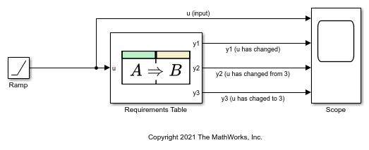 This example shows how the operators hasChanged, hasChangedFrom, and hasChangedTo detect specific changes in an input signal. In this example, a Ramp (Simulink) block sends a discrete, increasing time signal to a Requirements Table block.